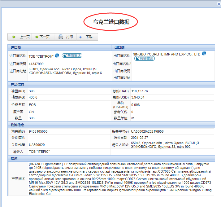 乌克兰贸易数据是乌克兰与全球所有贸易公司的每一笔海运交易记录,包含进口数据和出口数据。